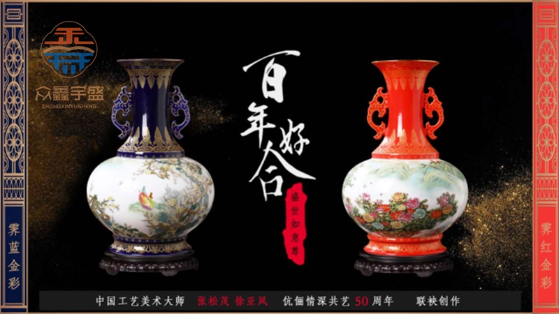 【藏品名称】:百年好合盛世如意尊 【藏品规格】:高约43.5cm 肚径约30cm 【藏品工艺】:粉彩 高温霁蓝釉 霁红釉 描金
