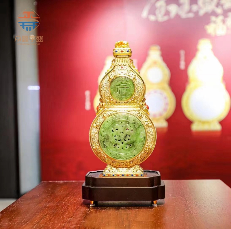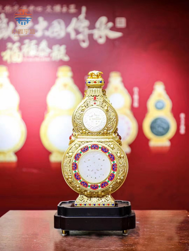 《福禄泰瓶》作品通高约230毫米,共有白玉手镯版、白玉镯芯版和碧玉手镯版三个版本,甄选贵金属与天然优质和田白玉、猛犸牙为载体,结合多重非遗技艺匠心创作。
