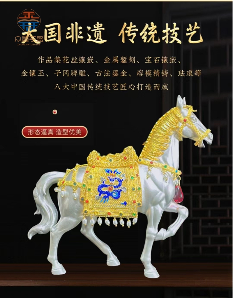 【藏品名称】:花丝镶嵌马到成功 曾建中大师所创作的作品《马到成功》是一款威武雄壮、神韵十足的艺术大作,是曾建中大师取材于清代郎世宁画作《乾隆骑马图》而精心创作的一款得意之作。作品中的马,强壮、彪悍、坚毅、高贵、力鼎千钧。曾建中正是通过《马到成功》向人们表现了自强不息、奋斗不止的精神,以及事业马到成功的美好寓意。曾建中大师花丝镶嵌《马到成功》作品集花丝镶嵌、金属錾刻、宝石镶嵌、金镶玉、子冈牌雕、古法鎏金、熔模精铸、珐琅等八大中国传统技艺匠心打造而成。