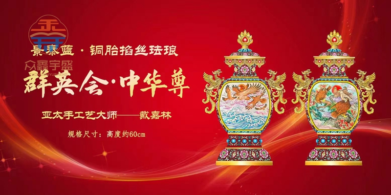 【藏品名称】:群英会·中华尊 【藏品规格】:高约60cm 肚径约39cm 【创作大师】:戴嘉林 【藏品工艺】:景泰蓝 铜胎掐丝珐琅