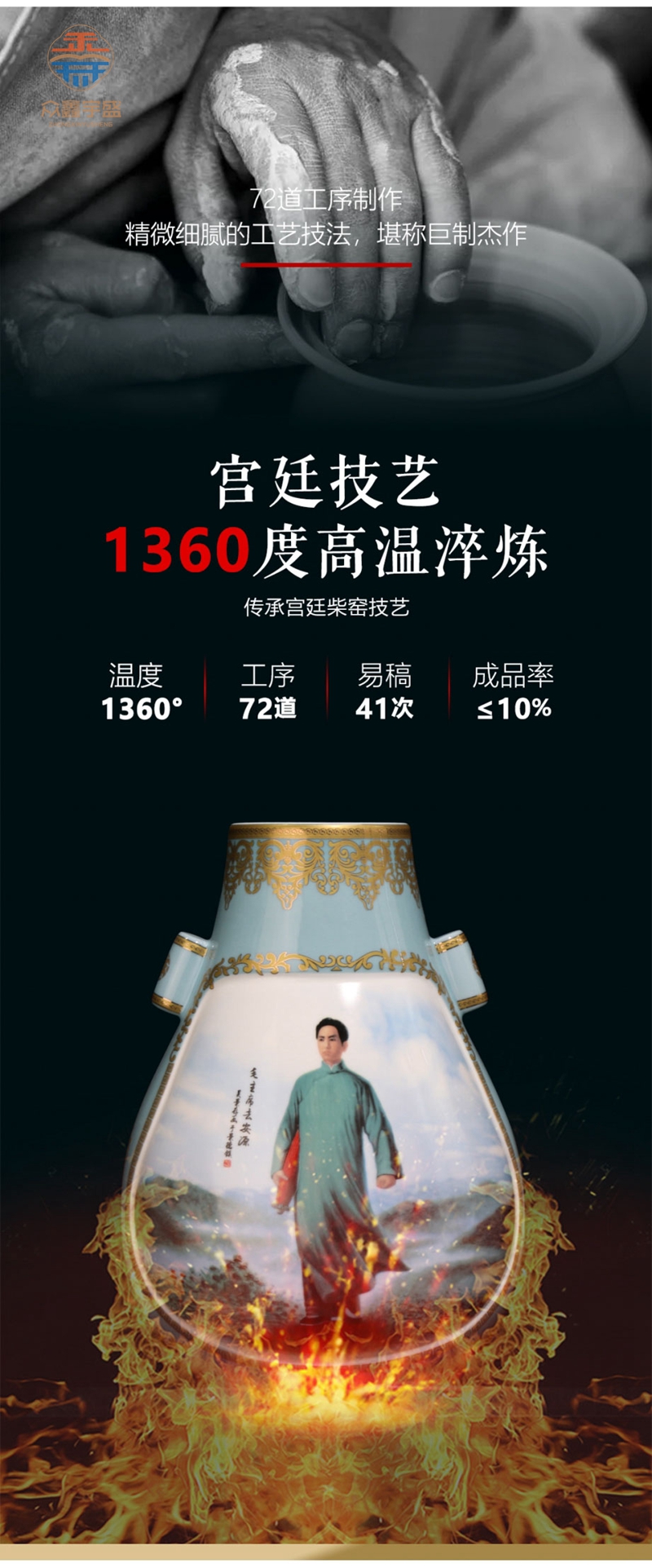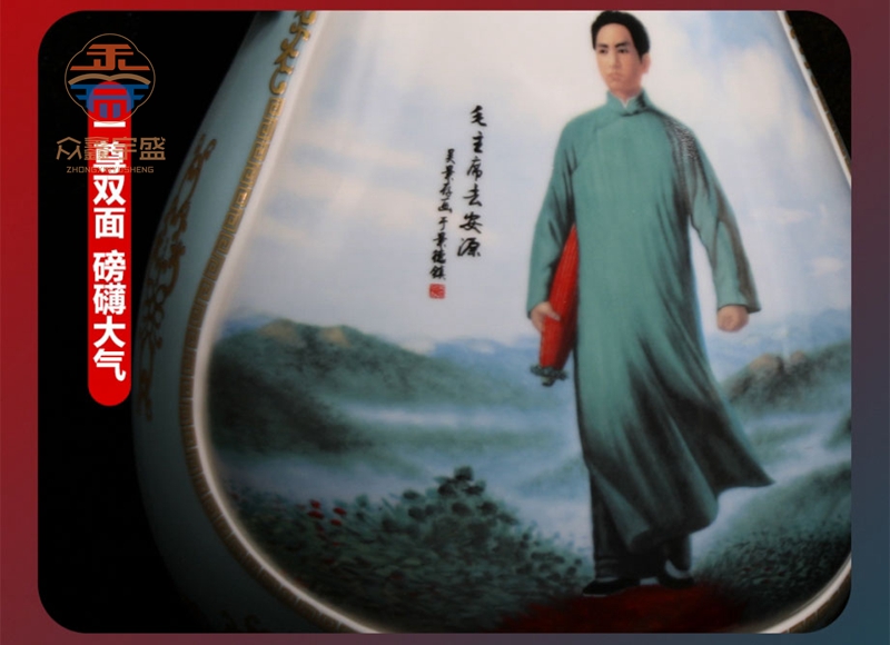 《荣耀东方》领袖尊体感极强,笔韵文雅秀逸,色彩浓艳明朗,造型婀娜多姿,层次十分丰富细腻,体现了吴景存和钟子龙两位大师扎实、精致的艺术功底。工艺为釉上重工粉彩,手工拉坯,手工修坯,再历经上百道复杂工序反复三次入窑烧制而成,画面上仅山石的色彩就多达数种,任何细节的不慎都会导致前功尽弃,不成功的成品需全部打碎,成品率不足 10%,可谓一尊成型万瓶碎。