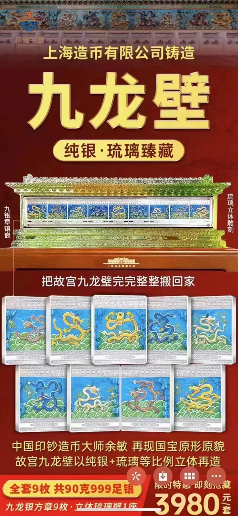 【藏品名称】:《九龙万福》九龙壁纯银·琉璃臻藏 【出品机构】:上海造币有限公司铸造 【创作大师】:中国印钞造币大师余敏 【藏品形式】:纯银方章+立体琉璃摆件 【藏品图案】: 造币级纯银彩印工艺,将国宝九龙壁以纯银+琉璃原形原色原貌立体再造