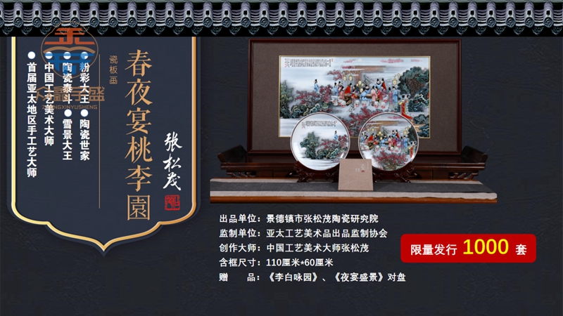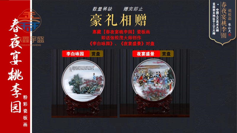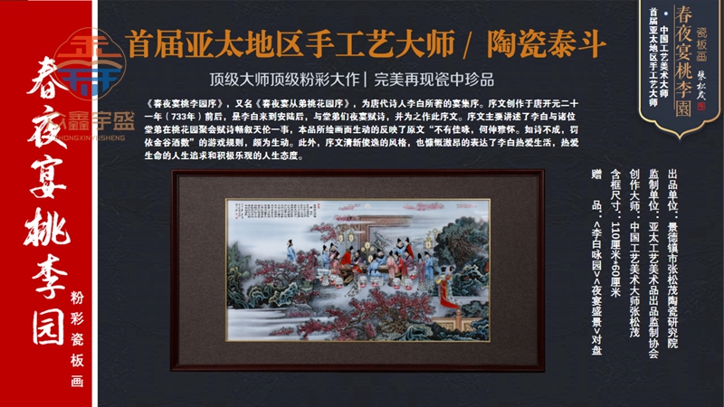 【藏品名称】:春夜宴桃李园粉彩瓷板画 【赠 品】:李白咏园、夜宴盛景对盘