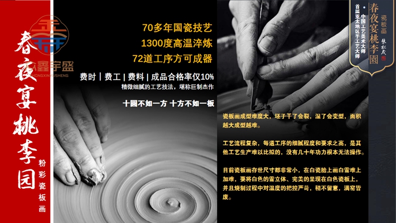 瓷版画烧制过程中,因瓷版无圆周张力,所以比瓷瓶、瓷盘等更难完成,极易发生变形、窑裂,成功率极低,需要多次入窑复烧,报废率高达60%以上,有“一版成器万版废”之说。《春夜宴桃李园》瓷板画,画面主题突出,层次分明。画左,怪石突元,乱麻皱染石洞。体现了国瓷泰斗张松茂大师扎实、精致的艺术功底。工艺为釉上重工粉彩,手工拉坯,手工修坯,再历经上百道复杂工序反复三次入窑烧制而成,任何细节的不慎都会导致前功尽弃,不成功的成品需全部打碎,成品率不足10%,可谓一方成型万方碎。