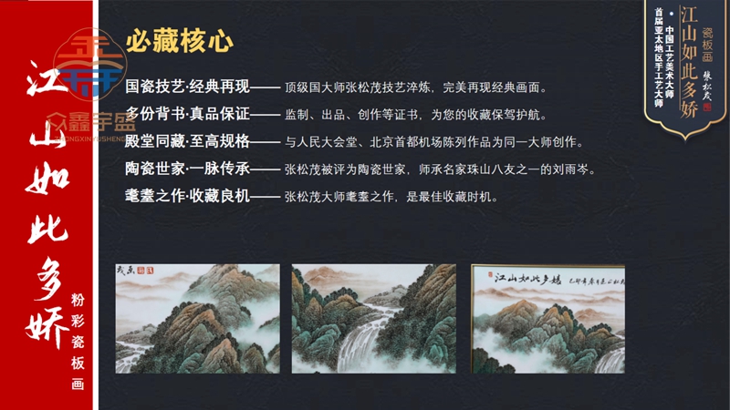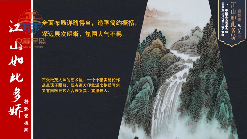 构图、线条、色彩、意境表现的淋漓尽致,又烙上现代山水画的印记。《江山如此多娇》瓷板画经多次高温入窑烧制而成,工序复杂,成瓷难。张松茂大师的瓷艺作品,予人印象最深之处便是其蓬勃的气势,极具震撼的画面语言,以及粉彩的诸多优质之处,熟悉至瓷艺之本质。在张松茂大师的艺术里,一个个精美绝伦作品呈现于眼前,既有西方印象派之恢弘写实,又有国粹技艺之古雅秀美,震撼世人。