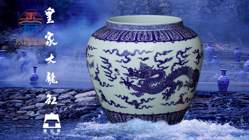 《皇家大龙缸》直口、短颈、口沿处饰卷草纹腹部主体所绘两条巨龙,一龙戏珠在前,一龙紧随其后,相互追逐而行。它们昂首曲颈,怒目圆睁,四肢强劲有力,五爪呈风车状,勾爪锋利:双龙升腾于云海间,似在嬉戏,又似在兴云布雨展现出威武姿势,尽显皇家气派。