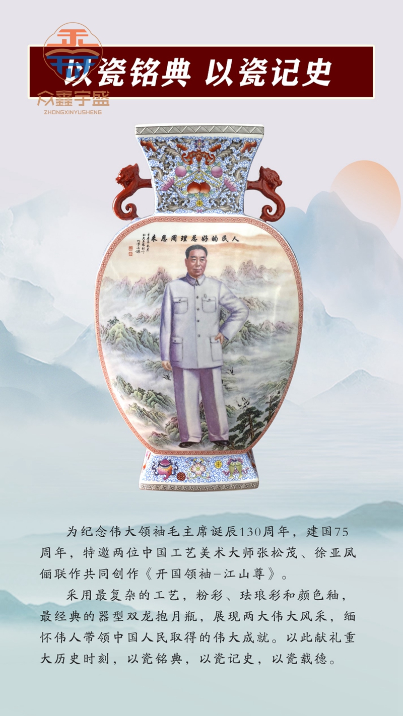 【藏品名称】: 开国领袖-江山尊 【藏品作者】: 张松茂、徐亚凤 【藏品工艺】: 重工粉彩 【藏品规格】: 高49.5cm