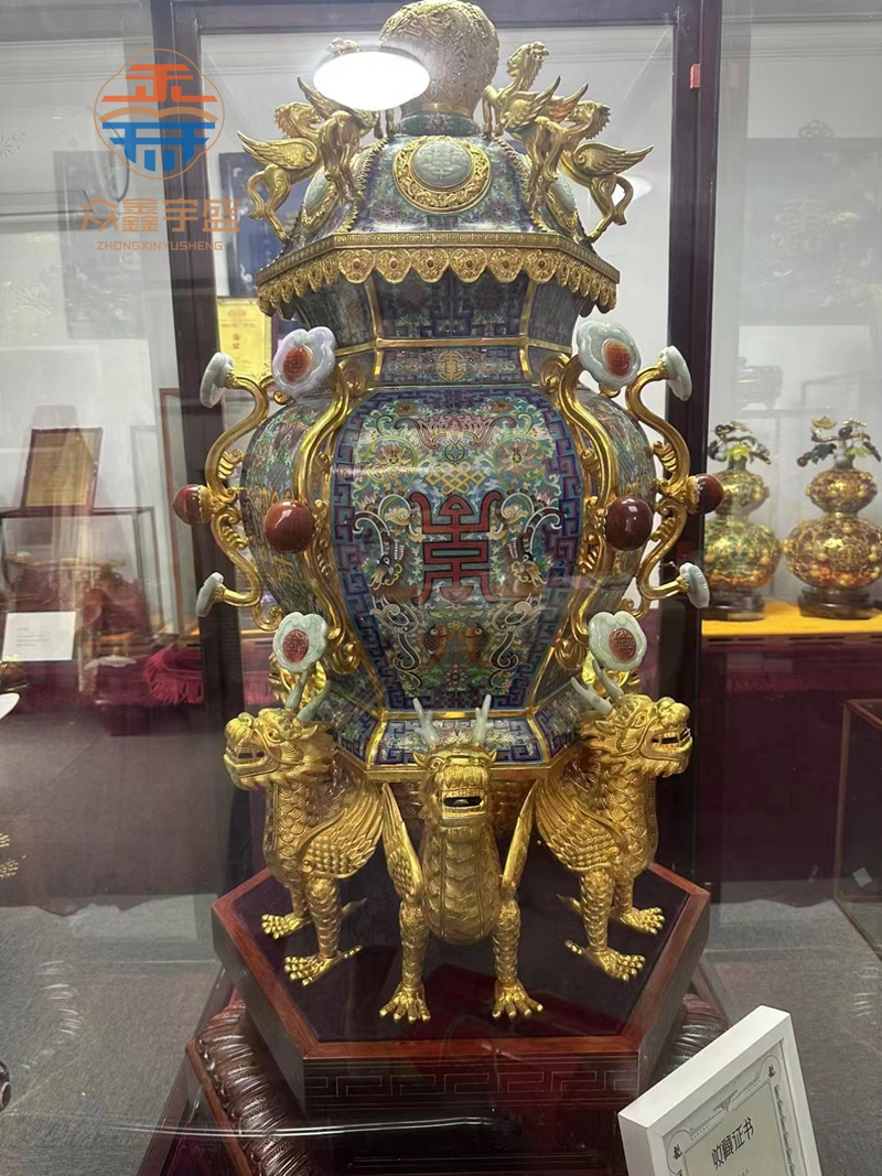 此珍品是刘永森老先生,从艺十周年时,为祝贺成龙先生六十大寿贺礼,经过一年之久精心创作设计和巧妙打造,制成了当代珍品景泰蓝嵌玉“六龙如意宝鼎”