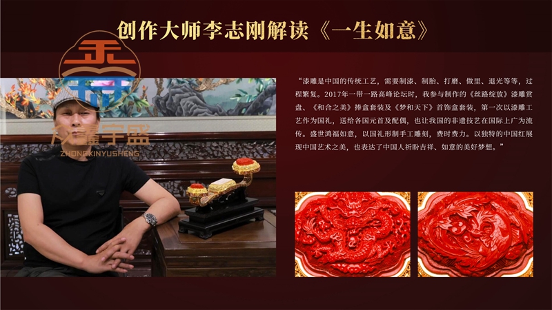 【产品名称】:一生如意鸿运典藏版 【创作大师】: 刘永森、李春珂、李志刚、赵春明、鲍国增 【产品工艺】: 景泰蓝、牙雕、漆雕、花丝镶嵌 【产品材质】: 铜胎镀金、猛犸象牙、雕漆 【产品规格】: 356mm*106mm*96mm(不含底座) 【限量发行】: 199套