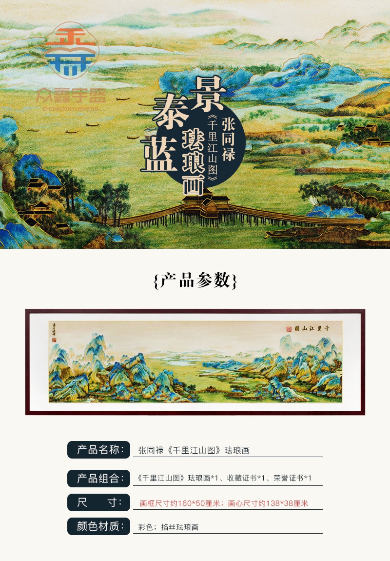 【产品名称】:《千里江山图》掐丝珐琅画 张同禄掐丝珐琅画《千里江山图》全长160cm,精选北宋天才画家王希孟原作《千里江山图》中最为精妙传神部分:以利往桥和垂虹亭为审美中心向左右延展,利往桥为“北宋第一长桥”,三起三伏,蜿蜒似龙”,其壮丽秀美,更是独步江南,素以“江南第一长桥”而闻名遐迩。垂虹亭壮丽秀美,逼真地呈现这一片色彩绚丽、犹如仙境般的江南风光。同时,群山冈峦和浩淼的江河湖水, 山岭、坡岸、亭台楼阁、茅居村舍,驶船等,用掐丝珐琅工艺刻画得精致细腻,意态生动,景物繁多,气象万千!写实与写意兼具,古意与创新相融,将中国传统青绿山水画与掐丝珐琅工艺相结合,表现出一种笔墨所无法迄及的独特立体艺术效果,成为首款珍品名画掐丝珐琅工艺大作!掐丝珐琅画《千里江山图》聚江山灵气,盛世风华,寓意背倚江山,顺风顺水、气象万千,天下吉祥!