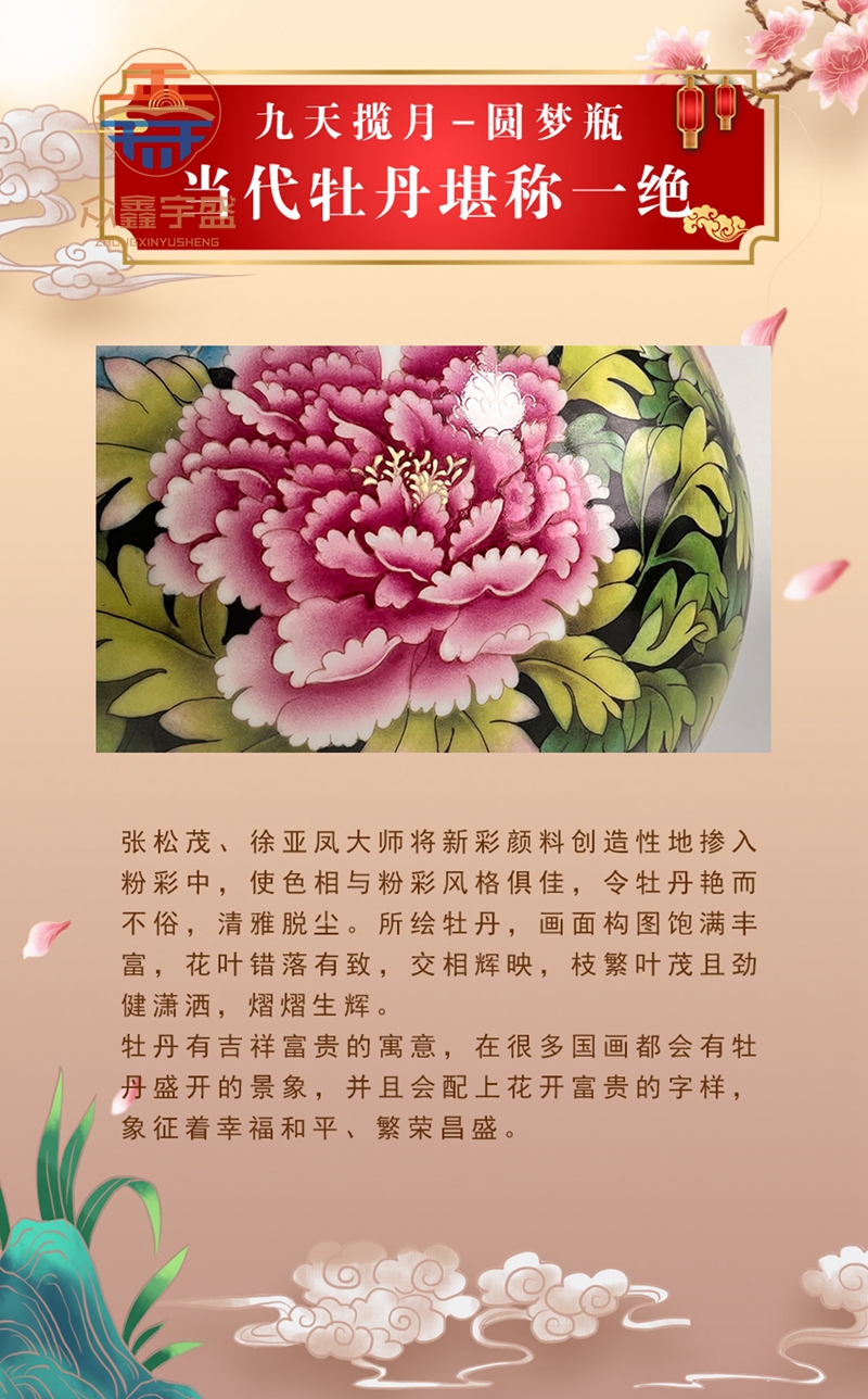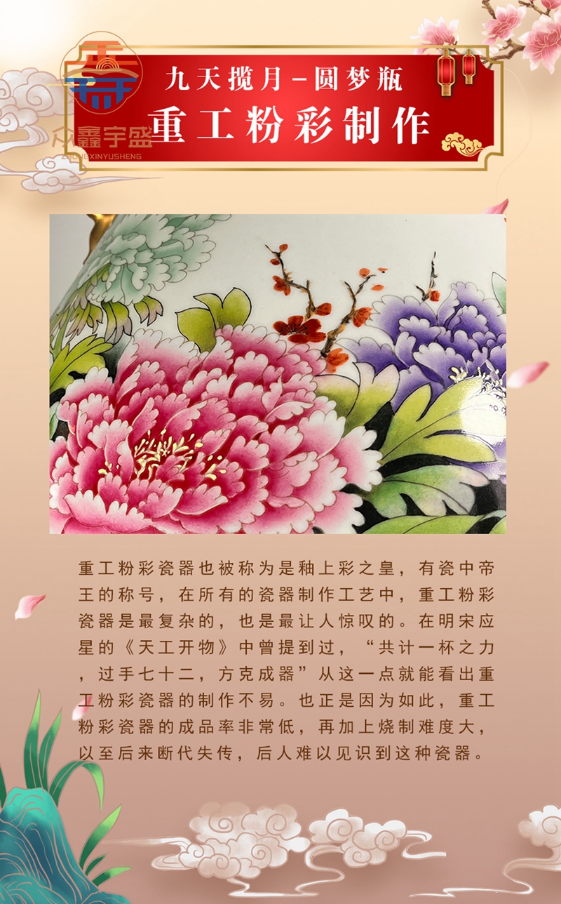 【藏品名称】:九天揽月圆梦瓶 【藏品创作】:张松茂、徐亚凤 【藏品工艺】:重工粉彩 【藏品规格】:高度约39.8cm 口径约16.6cm