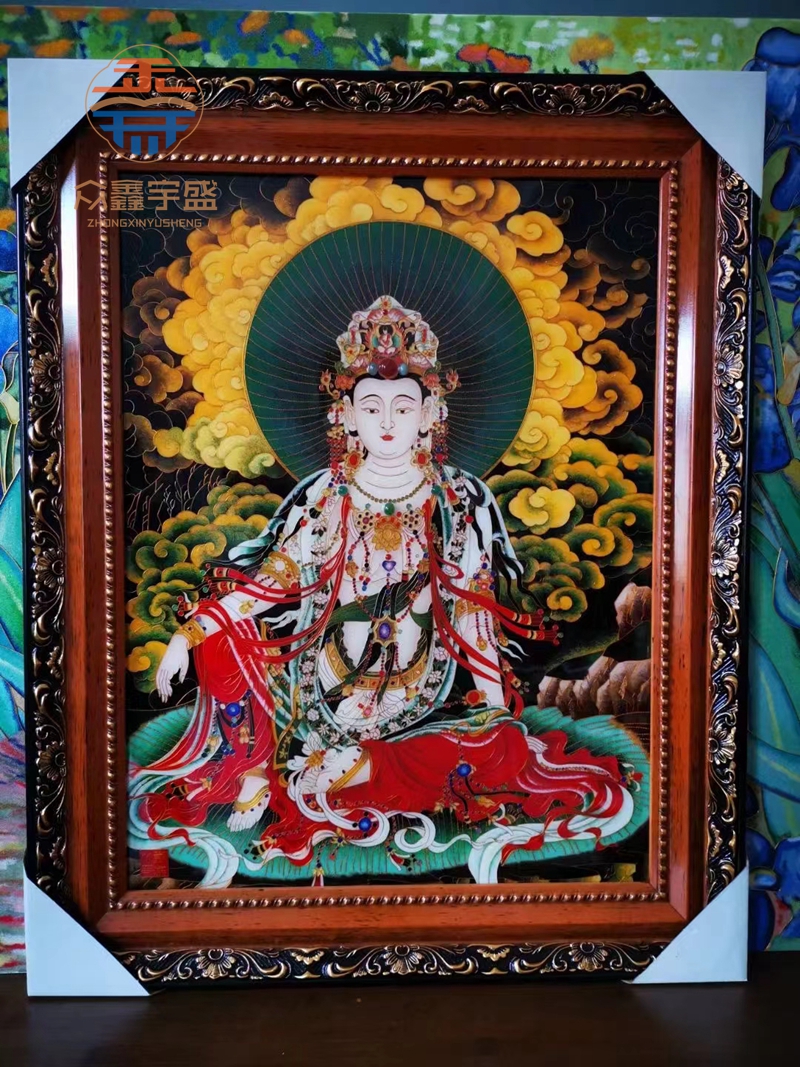 【藏品名称】:戴嘉林大师作品《掐丝珐琅水月观音》法像 【藏品规格】:高74厘米,宽59厘米;画面净高60厘米,净宽45厘米 【创作大师】:戴嘉林 【藏品工艺】:纯手工掐丝珐琅