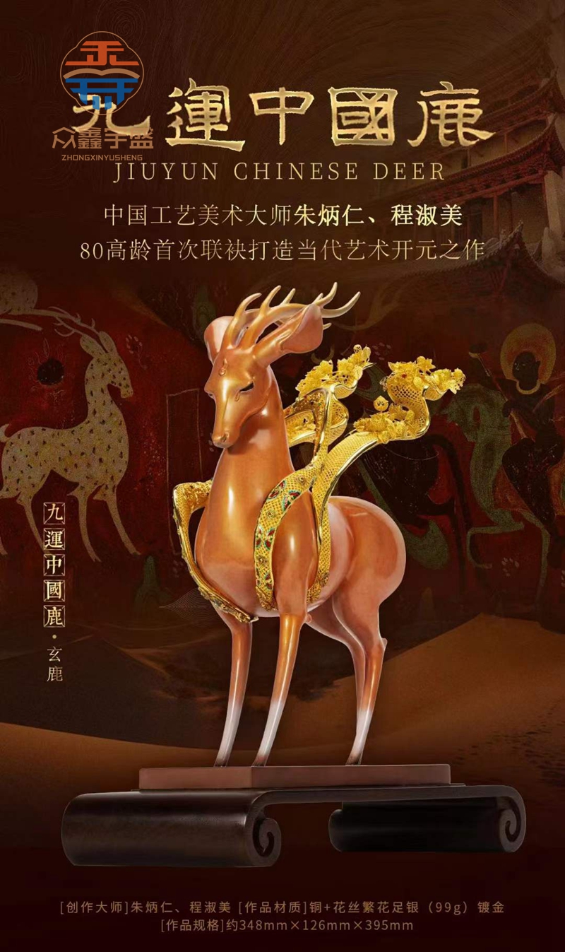 鹿,作为传统文化的中的祥瑞之兽,象征吉祥、长寿与和谐。《九运中国鹿》造型灵感来自敦煌莫高窟第257窟北魏时期壁画《鹿王本生图》中的九色鹿,将铜雕、花丝镶嵌两大非遗技艺巧妙结合,工艺精湛。鹿王体态丰盈优雅,四肢矫健有力,大耳兼听纳福,眉目慈善仁爱,全身采用高温珐琅彩铜技艺着色,素雅中又凸显几份庄重华丽,颇具皇家气韵。鹿身舞动的飘带以花丝镶嵌技艺精心设计而成,花丝之上镶嵌五色宝石,尽显富贵华丽。花丝飘带绕过鹿身烈烈飞扬,鹿如天神下凡,威仪无限,护佑一方吉祥安康。