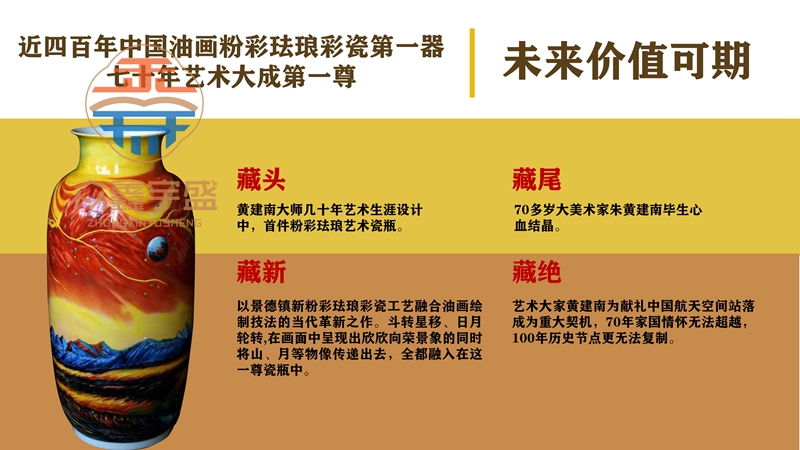 黄建南先生为庆祝中国航天天宫空间站落成,特 为此献礼,制作这一问鼎之作。 这一尊名为《锦绣中华》的彩瓷在传统瓷工艺里 做出了一次完美的艺术突破,这一作品选用了“黄建 南”大师三大系列中最具有代表性的两幅油画作品来 进行创作,每个画稿都做了高度的还原创作,其中盘 面中的构图,色彩及景物都经过了长时间的反复修改 与调整,让作品既遵循了原作的色彩景物,又提炼了 原作品的精华浓缩于这方寸之间,使得每件作品都绽 放出独特的视觉效果和思想意境。 《锦绣中华》粉彩珐琅彩瓷瓶是著名画家黄建南老师领衔设计、创作,并由黄建南工作室的老师们 手绘出品。以大美山河为主体,融入了多种强烈对比 的艺术风格,采用了釉上新彩,珐琅彩工艺,兼具粉彩 中的玻璃白堆雕手法,达到了凸起浮雕油画效果。瓶口瓶底用了本金资金包边,增添了吉祥富贵之气,以娴熟的技法和绵延不断的通景画面展现在大家的视野当中。斗转星移、日月轮转,在画面中呈现出欣欣向荣景象的同时将山、月等物像传递出去,全都融入在这一尊瓷瓶中。“山月岂知天下事,只缘身在此山中”, 细微处见大度,色彩斑斓,美轮美奂:豪放处见力度,精 彩卓绝,无与伦比。