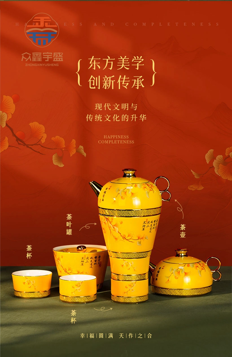 本作品源自于经典梅瓶造型,将梅瓶造型一分为四一壶、一罐、两杯。器型表面以银杏叶做为点缀,底部辅以万寿金丝纹,寓意幸福圆满,健康长寿。本作品可作为艺术摆件,又兼具茶具的实用性,将金丝珐琅与陶瓷珐琅完美融合于一体,成就珐琅双绝惊世之美。