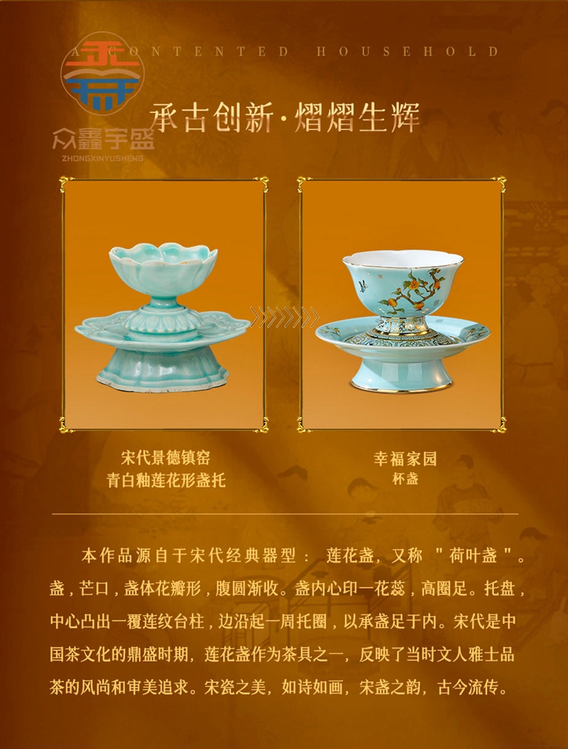 本作品源自于宋代经典器型:莲花盏,又称"荷叶盏盏,芒口,盏体花瓣形,腹圆渐收。盏内心印一花蕊,高圈足。托盘中心凸出一覆莲纹台柱,边沿起一周托圈,以承盏足于内。宋代是中国茶文化的鼎盛时期,莲花盏作为茶具之一,反映了当时文人雅士品茶的风尚和审美追求。宋瓷之美,如诗如画,宋盏之韵,古今流传。