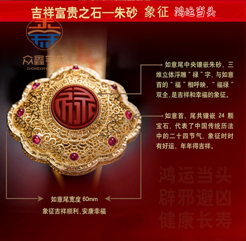 为庆祝“生肖大年”,龙年,献礼故宫博物院建院100周年,中国工艺美术大师,中国当代花丝镶嵌第一人,王树文大师及儿子王成,父子联袂倾力创作,历史上首款花丝镶嵌《九龙如意》。 以故宫馆藏《七成金累丝嵌石如意》为原型,以九龙为元素以其精湛的花丝镶嵌和玉雕技艺,与故宫的建筑风格和文化内涵完美契合,创造出细腻而精美的图案。