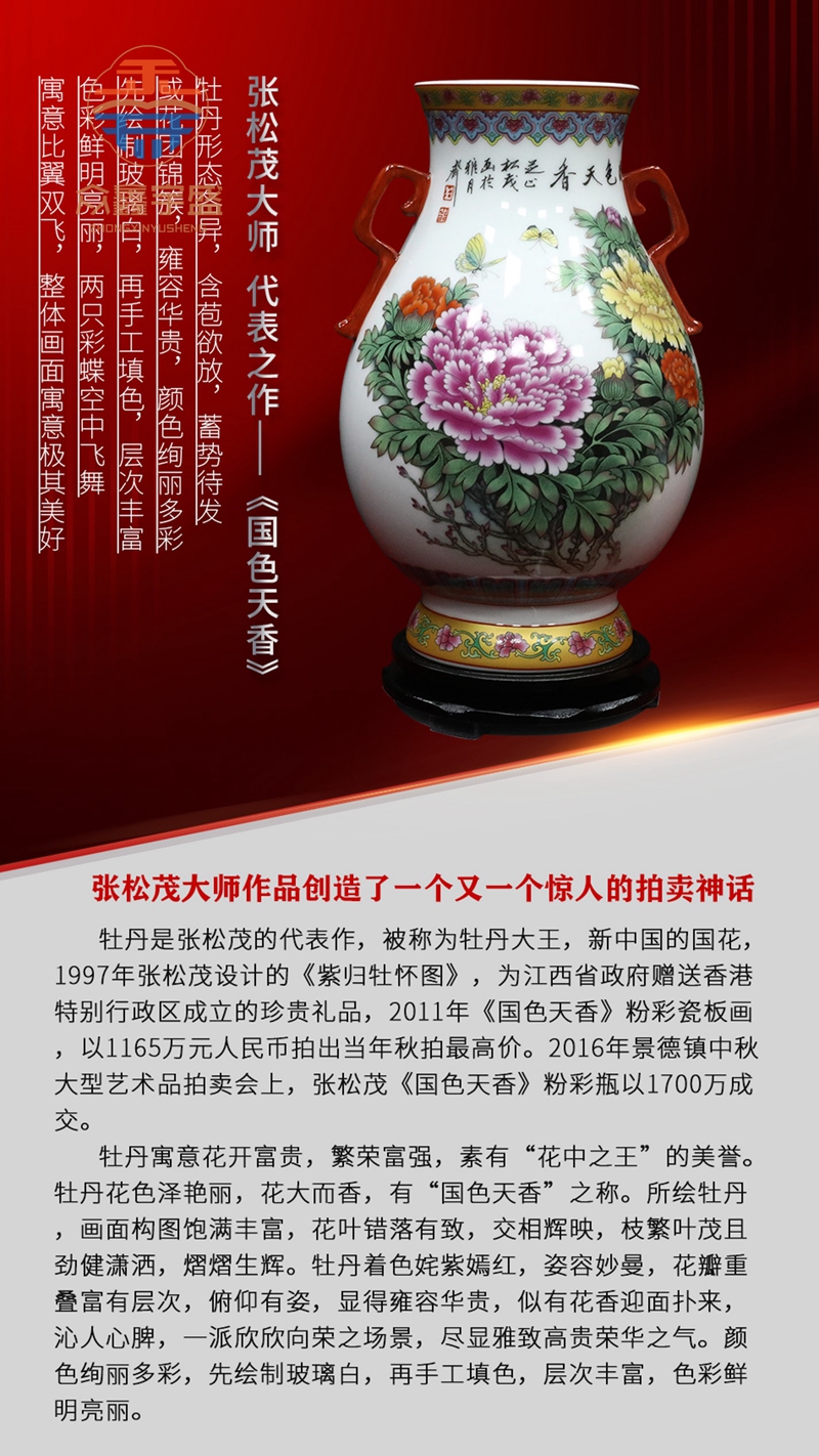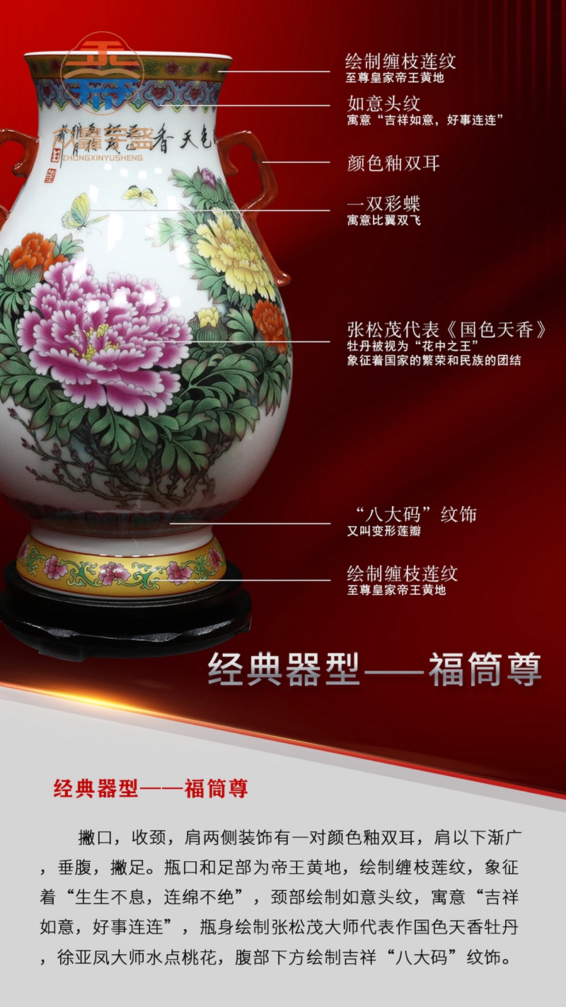 【藏品名称】:《盛世繁花》双耳福筒尊 【创作大师】:张松茂、徐亚凤 【藏品工艺】:重工粉彩、水点桃花、颜色釉 【出品单位】:景德镇百年陶瓷珍品馆 【监制单位】:景德镇市张松茂陶瓷研究院 【藏品规格】:高约37.5cm,口径13.5cm,足径14.5cm 【藏品包装】:瓷瓶“1,收藏证书*1,底座*1
