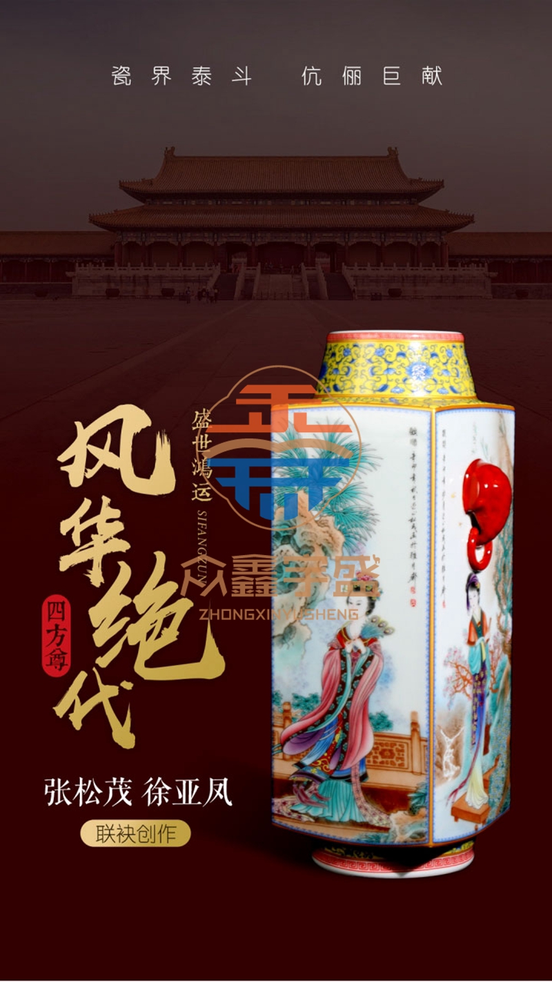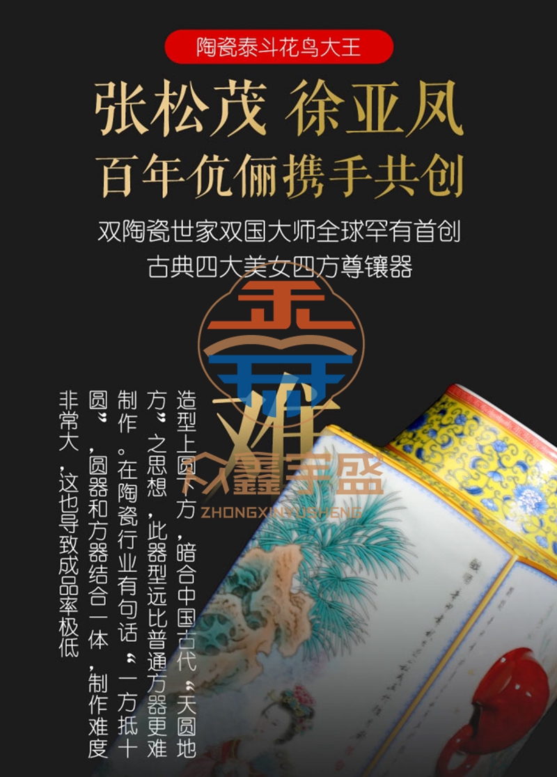 陶瓷泰斗花鸟大王 张松茂 徐亚凤百年伉俪携手共创 盛世鸿运风华绝代四方尊 双陶瓷世家双国大师全球罕有首创古典四大美女四方尊镶器