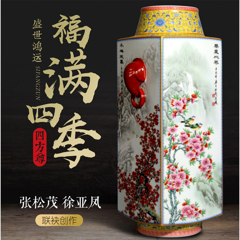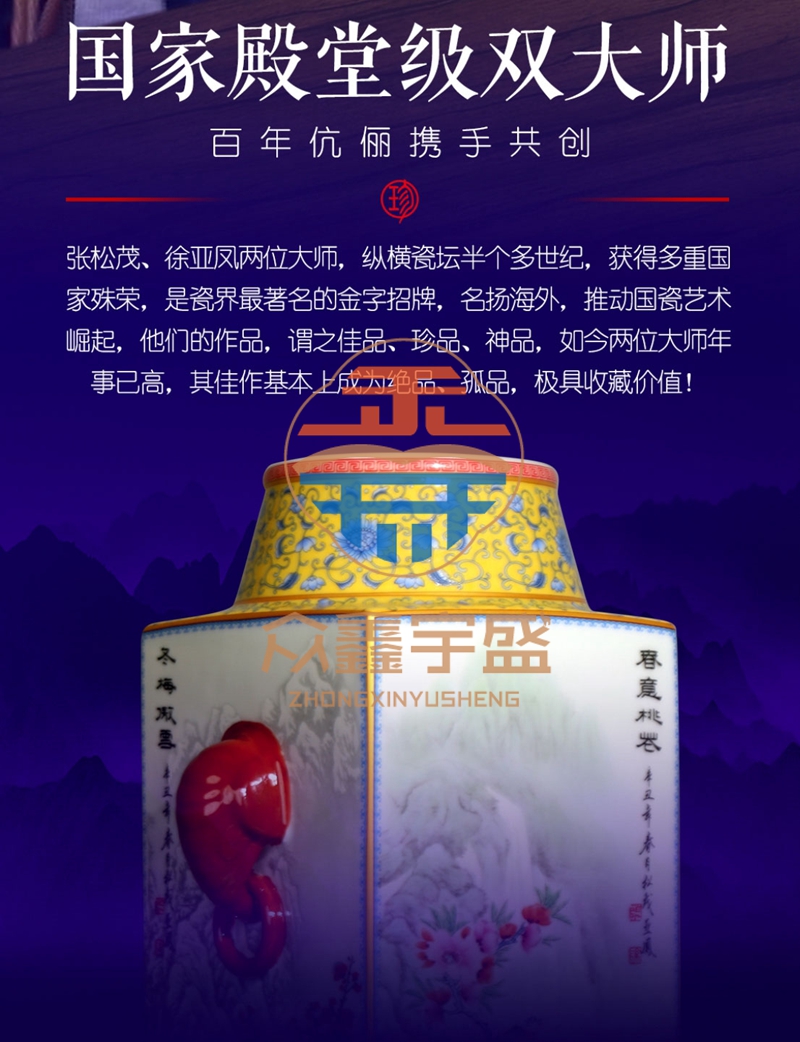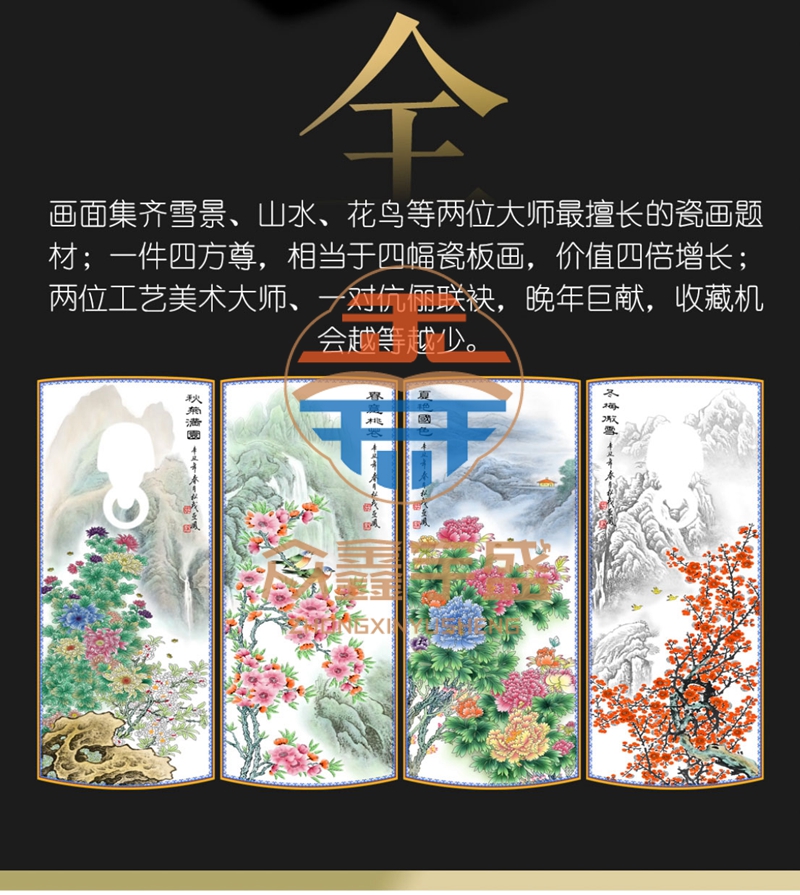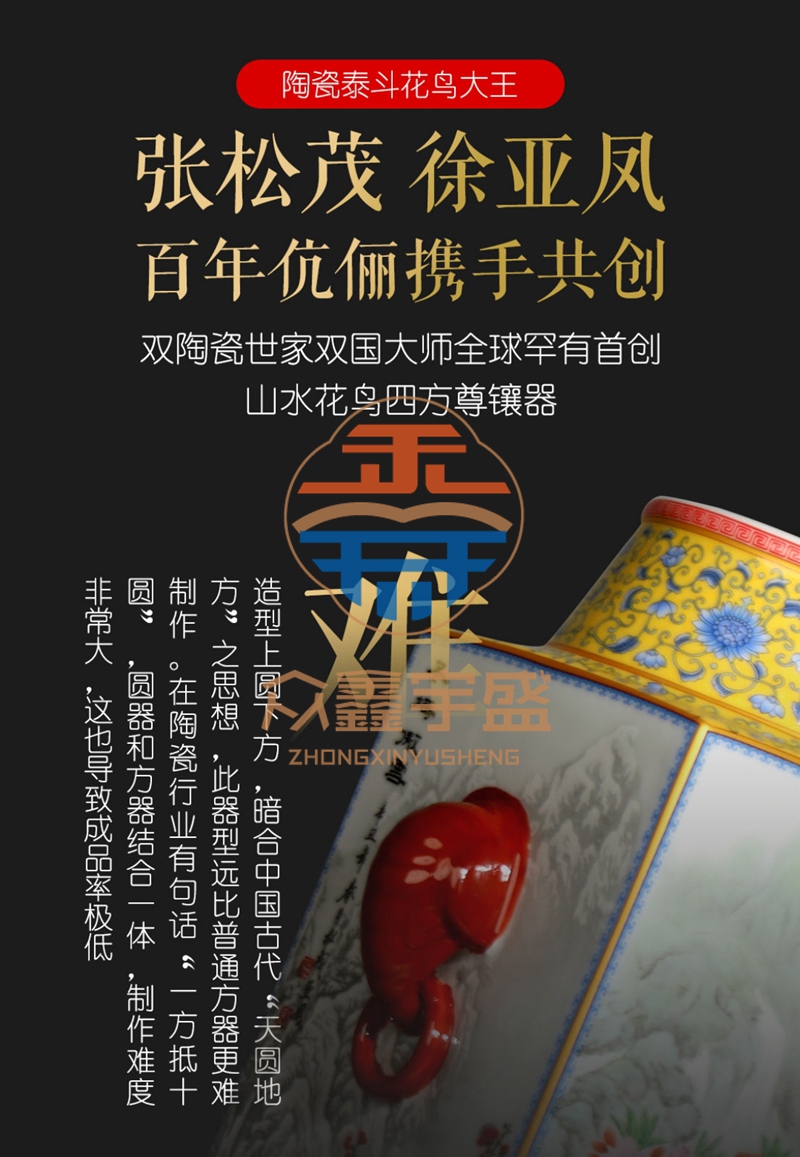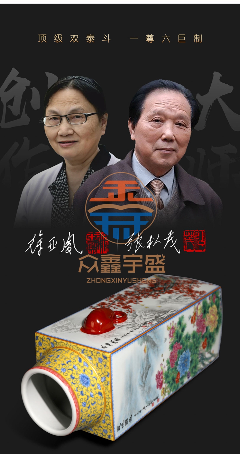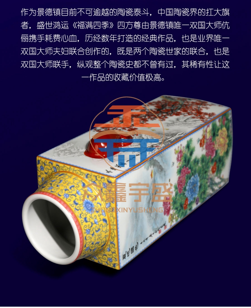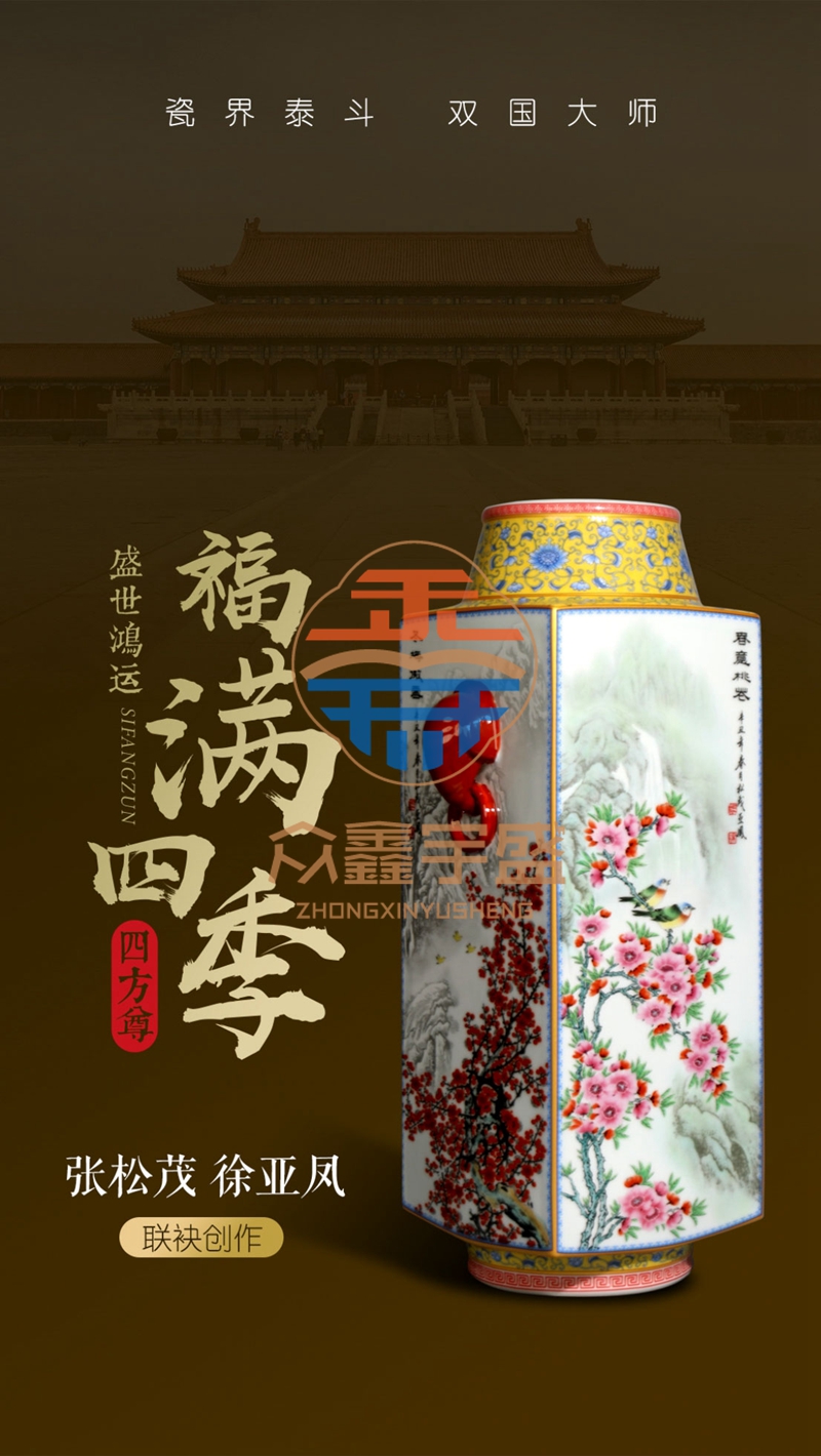 张松茂、徐亚凤创作 盛世鸿运《福满四季》四方尊 画面集齐雪景、山水、花鸟等两位大师最擅长的瓷画题材;一件四方尊,相当于四幅瓷板画,价值四倍增长;两位工艺美术大师、一对伉俪联袂,晚年巨献,收藏机会越等越少。 作为景德镇目前不可逾越的陶瓷泰斗,中国陶瓷界的扛大旗者,盛世鸿运《福满四季》四方尊由景德镇唯一双国大师伉俪携手耗费心血,历经数年打造的经典作品,也是业界唯一双国大师夫妇联合创作的,既是两个陶瓷世家的联合,也是双国大师联手,纵观整个陶瓷史都不曾有过,其稀有性让这一作品的收藏价值极高。