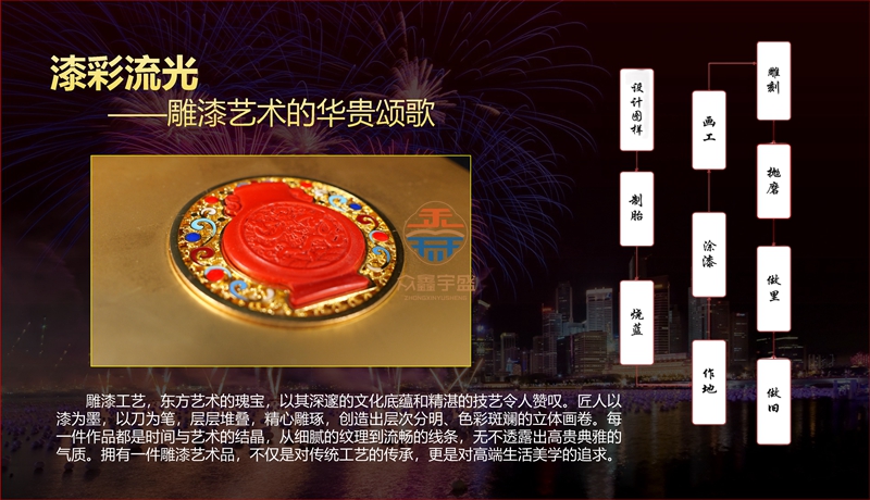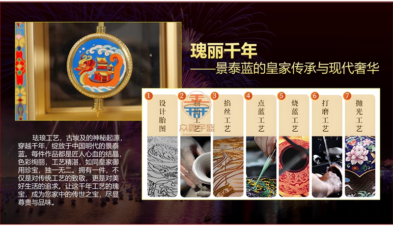 采用古钟表修复、画珐琅、玉雕、花丝镶嵌、雕漆、鎏刻、宝石镶嵌七大中国非物质文化绝技工艺