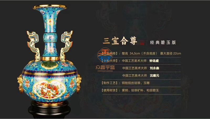 【作品名称】:《三宝合尊》经典碧玉版、雕漆版 【作品规格】:整高 34.5cm(不含底座)最大直径 22cm 【创制大师】:钟连盛 刘永森 沈建元 李志刚 【制作工艺】:铜胎掐丝珐琅、玉雕