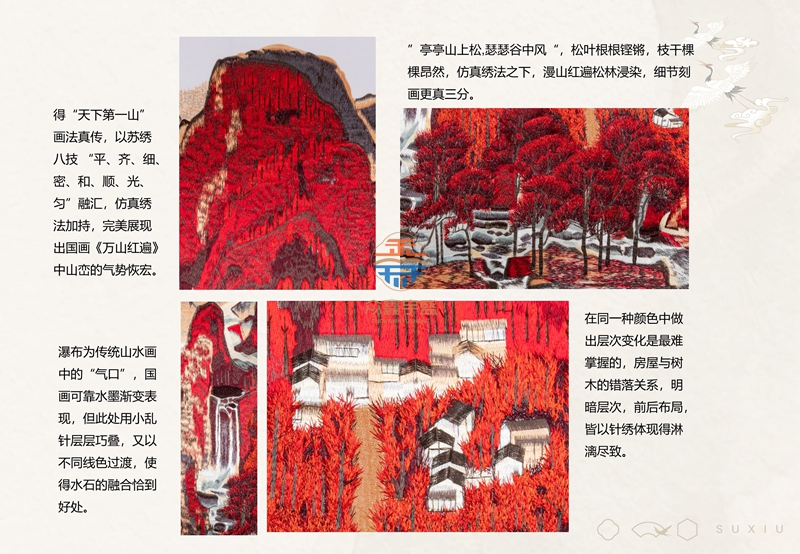 李家代表性积墨红色山水叠加国家级非遗传承技艺苏绣,其工艺之精湛、用色之大胆、意境之深邃,再多的赞美之词都不为过。