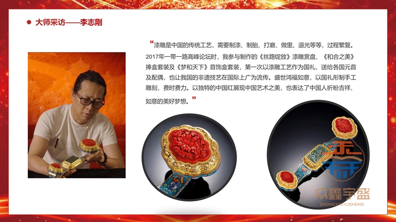 《盛世鸿福如意》以故宫馆藏《铜镀金累丝》为原型,将景泰蓝、玉雕、漆雕和花丝镶嵌四大中国非遗工艺有机融合,以中国传统文化为根本,大胆创新,精工细作,通过深契在中华民族心理独具喜庆吉祥寓意的如意,表达对盛世祖国的美好祝福,是中国历史上少见的集四大非遗工艺于一体的艺术佳作。 《盛世鸿福如意》展示了中国文化固有的色彩和技艺,色彩靓丽,工艺精湛。