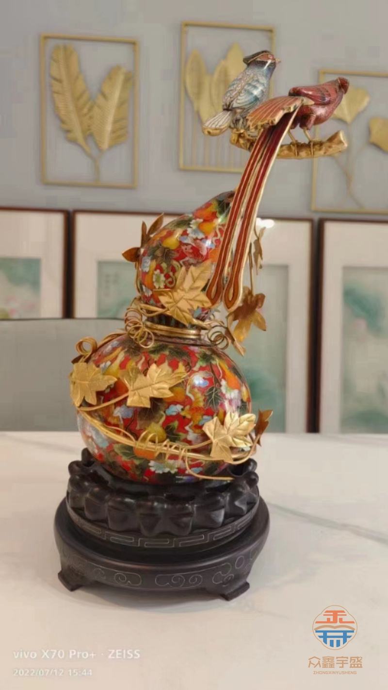 景泰蓝绶带葫芦高约30cm,主体金色的藤条瓜叶枝蔓缠绕着景泰蓝葫芦为主,葫芦枝蔓上有一对灵巧可爱的绶带鸟,以福、禄、寿为主题,全部以景泰蓝手工制作巧妙组合在一起,以全新的设计理念以传统文化为基础,赋予现代艺术表现的景泰蓝艺术品,开启了传统艺术品的推陈出新的多工艺组合形式,靓丽典雅的色彩令人耳目一新,整件作品寓意为多福多寿,子孙万代、平安吉祥。