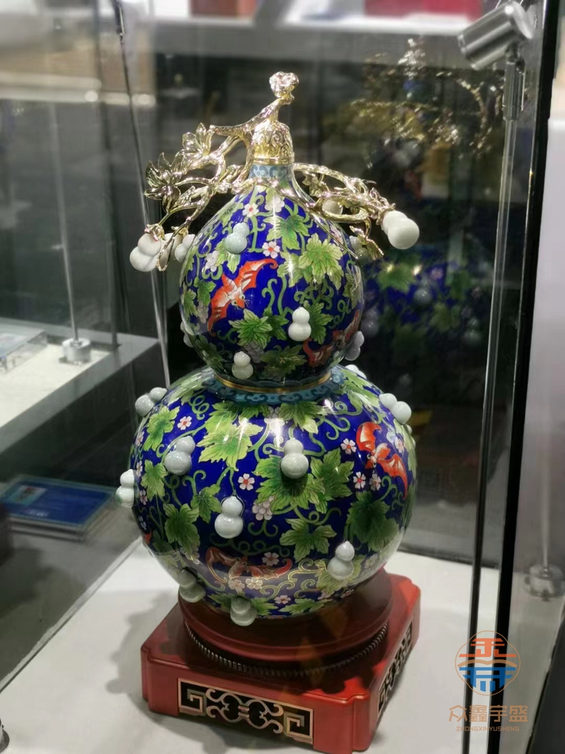 景泰蓝镶玉《百福临门》葫芦瓶是由刘永森等众多guo jia级工艺大师精心创作,600多位工艺美术师与工匠协作完成,由制胎、掐丝、烧焊、点蓝、烧蓝、磨光、镀金等108道传统皇家景泰蓝制作工艺外加60道现代纯手工工艺精琢而成,既传承了古代景泰蓝的制作工艺又具有现代时尚特征,有较高的鉴赏价值和收藏价值,堪称中国传统工艺的集大成者,实现传承和弘扬国粹文化艺术的非凡价