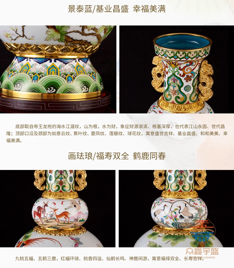 【藏品名称】:《盛世祥和》帝王三绝珐琅尊 【制作工艺】: 景泰蓝、画珐琅、珐琅彩 【藏品创作】: 刘永森、宁勤征、王采、孟德仁 【作品规格】: 高约46CM最大直径约22.5CM