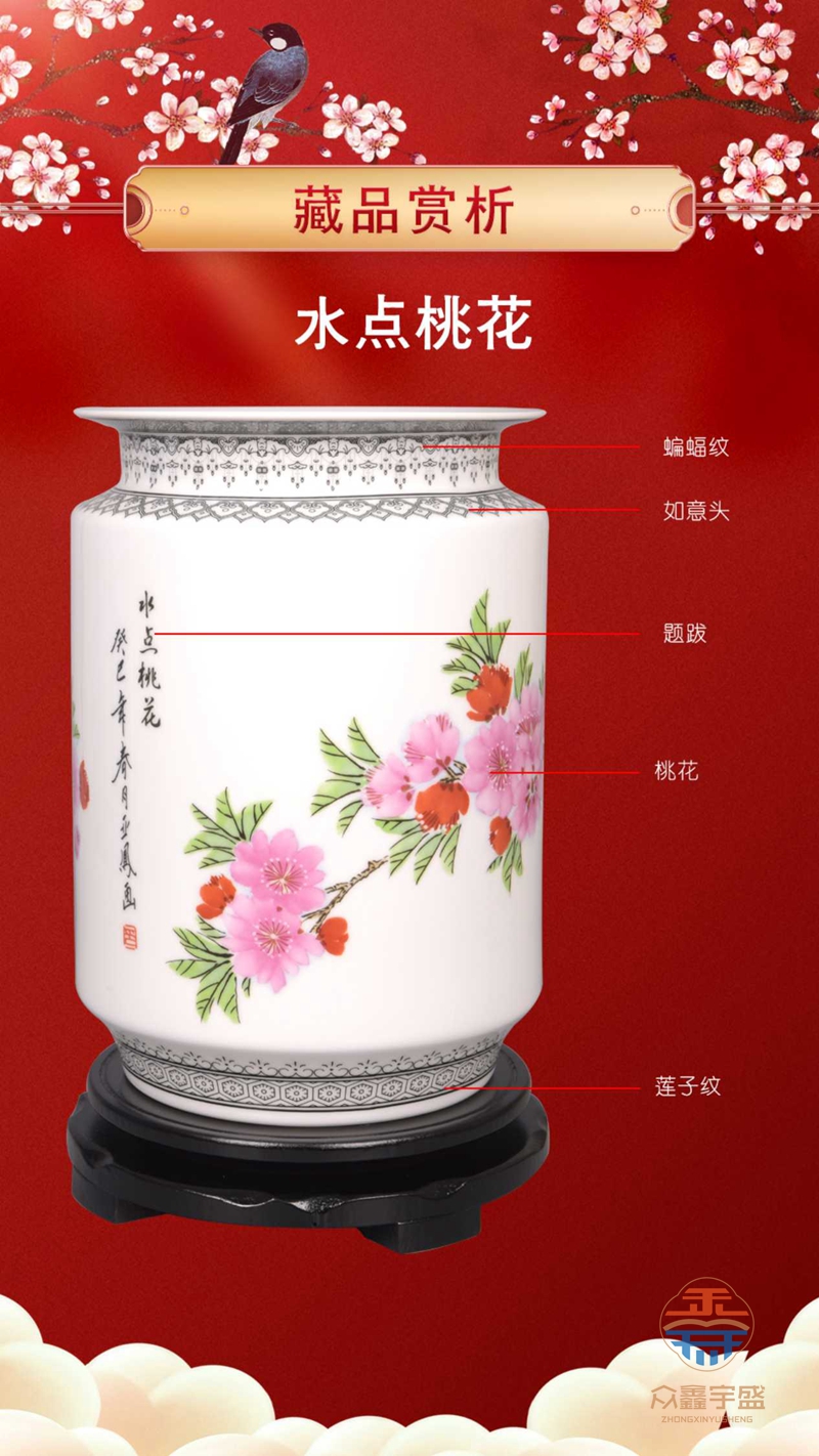 【藏品名称】:屏开富贵水点桃花棋子瓶 【藏品尺寸】:高约28cm、口径约19cm、 肚径约19cm、底直径约16cm 【创作大师】:中国工艺美术大师张松茂、徐亚凤 【藏品工艺】:重工粉彩工艺、水点桃花工艺 【出品单位】:景德镇百年陶瓷珍品馆