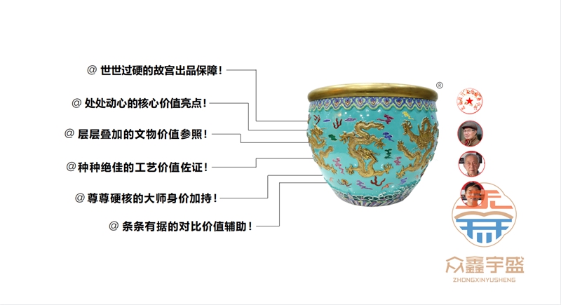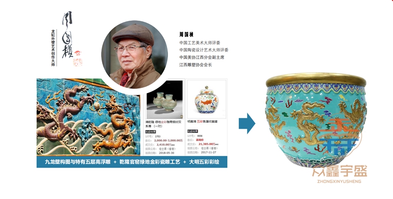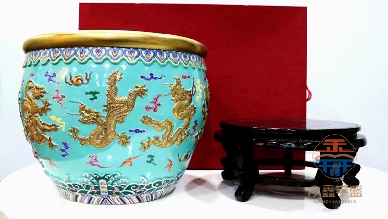 【藏品名称】:《祥瑞中华·九龙缸》 【藏品工艺】:瓷雕单色釉五彩金彩粉彩 【藏品规格】:高约32CM 【发行价格】: 19800元 【发行限量】:999