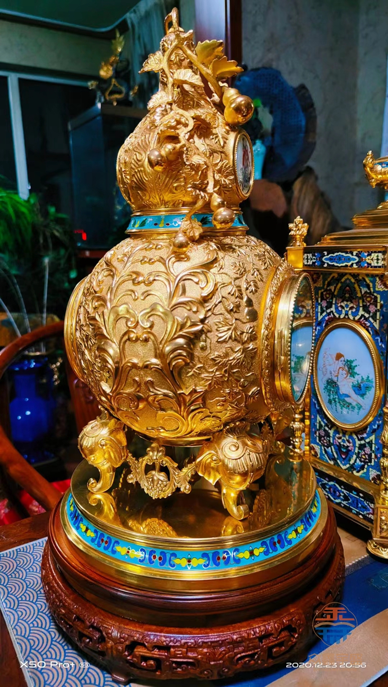此款钟创意来源于葫芦,葫芦谐音福禄,寓意福禄万代,是富贵吉祥的象征,故宫钟表图典收录的很多古钟表,均借鉴葫芦这一吉祥经典器型,深受皇家喜爱。座钟材质采用纯铜镀金,制作工艺采用锻造,手工錾刻,手绘珐琅,铸丝珐琅等多项传统工艺,打开后盖能够清晰的观看到机芯摆动走时,感受机械传动的即视美感。造型设计雍容华贵,寓意吉祥如意,富贵绵长,福禄万代,实为难得的艺术精品。