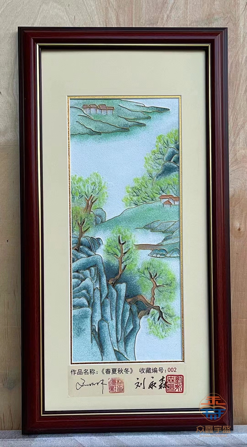 《景泰蓝春夏秋冬图》由刘永森大师纯手工打 造!尺寸为:宽27高52. 5厘米,格局很大,是以景泰蓝掐丝四条屏的方式所呈现的。每部分都是一处不同季节的风景,将春夏秋冬四季之景描绘收录在画卷之中。“春”首先描绘的是春天的景象,放眼望去一片生机勃勃的景象,万物复苏,给自然带来了第一丝生机感。感概自然风光之美。“夏”的描绘,清幽静谧,也利用色调上的变化和树木的繁盛来体现出夏景的繁茂。比起春景的描绘,夏景在颜色的选择上要比春景更加的浓厚,使得画面感十足,并且能带给人以清幽之感。“秋”景的描绘,在秋景的描绘上,主要采用了黄色调,秋季是丰收的季节。像是满山红叶,又像是旭日照耀。“冬”季,画面以描绘雪景为主,整幅中透着安静,万物休眠,细细品昧彷佛真能感受到雪季之中那种气息,实在让人描绘不出,可能这也就是自然的奇妙之处,总能带给人以新的体验。