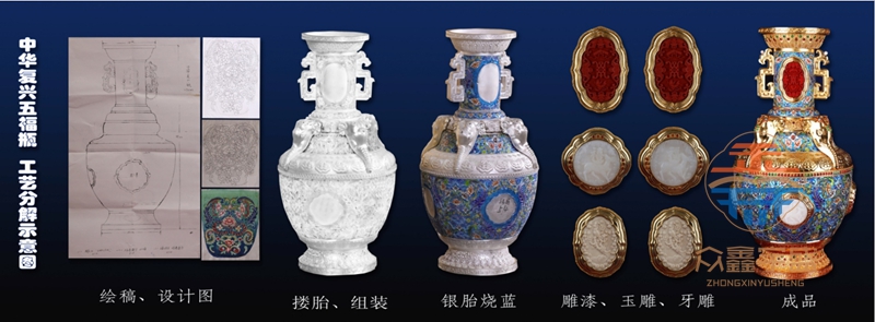 【藏品名称】中华复兴五福瓶 纪念紫禁城建成600周年 【领衔制作】王树文 米振雄 殷秀云 李春珂 冯道明 【藏品限量】60尊 【藏品器型】瓶 【藏品材质】纯银 漆 玉 天然宝石等 【藏品工艺】花丝镶嵌 烧蓝(银胎珐琅) 雕漆 玉雕等 【出品单位】北京故宫文化服务中心 【创作背景】纪念紫禁城建成600周年(1420—2020)