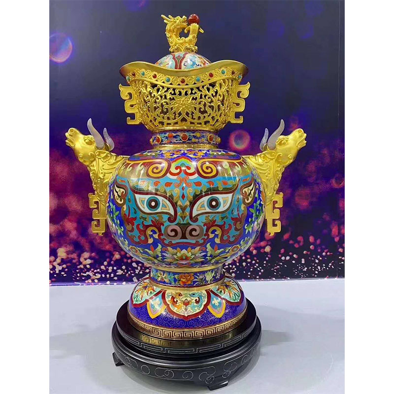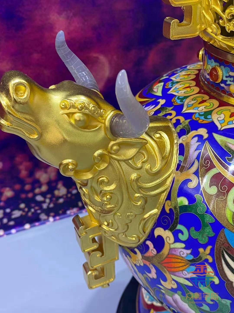 【藏品名称】:景泰蓝中国牛转乾坤 【藏品材质】:紫铜 【藏品工艺】:铜胎掐丝珐琅、金属錾刻、宝石镶嵌、镂空雕刻 【藏品规格】:高48cm