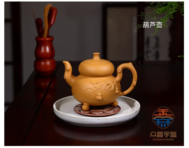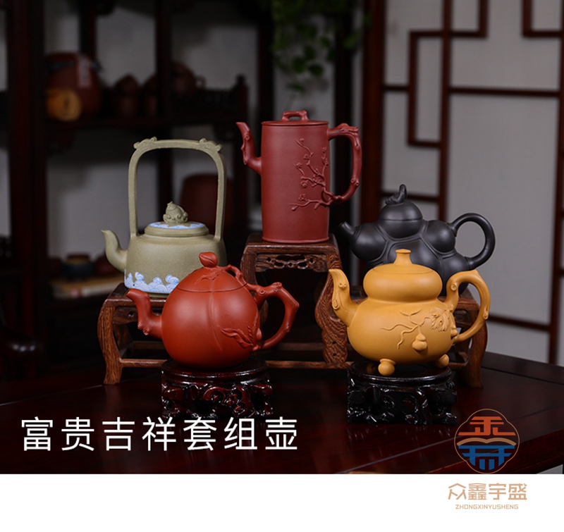 【藏品名称】:《富贵吉祥》紫砂壶套组 【藏品配置】:六福一手壶、葫芦壶、寿桃壶、梅花壶、鱼跃龙门壶 【藏品材质】:紫砂