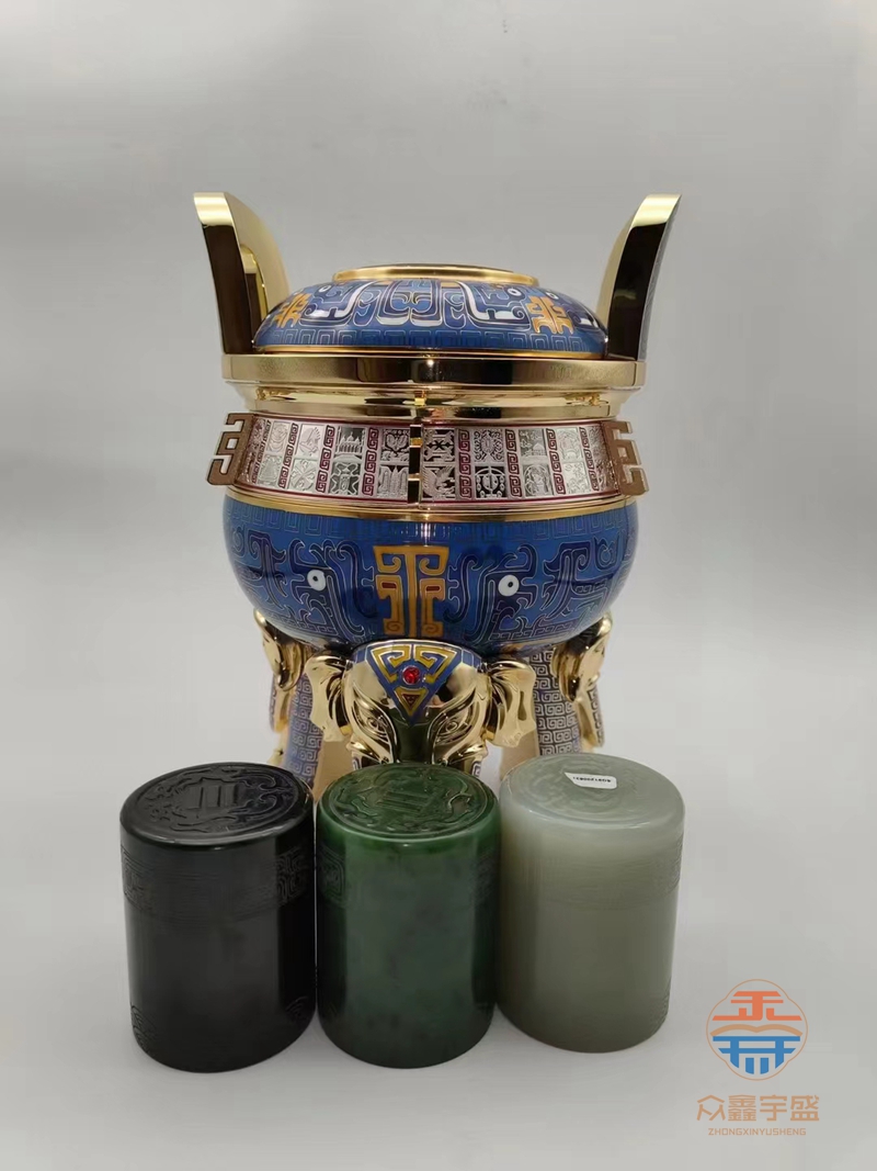 《鼎盛中国》是景泰蓝与和田玉结合的之作,色彩绚丽、造型丰富、体感饱满、富贵大气,展示出中华民族欣欣向荣、广袤博大 的胸襟,是国级大师刘永森、张志平首度合作的扛鼎之作!景泰蓝《鼎盛中国》整体造型庄严,器壁厚实,形制雄伟。