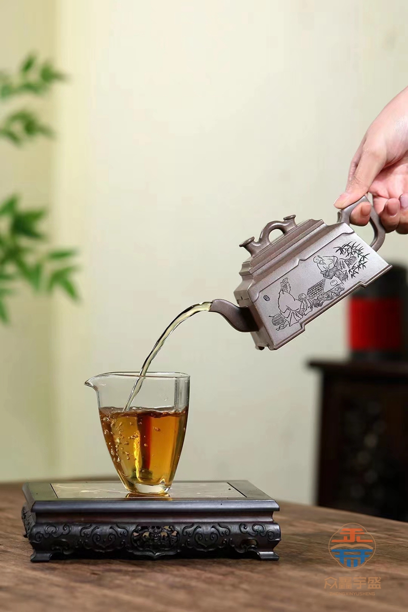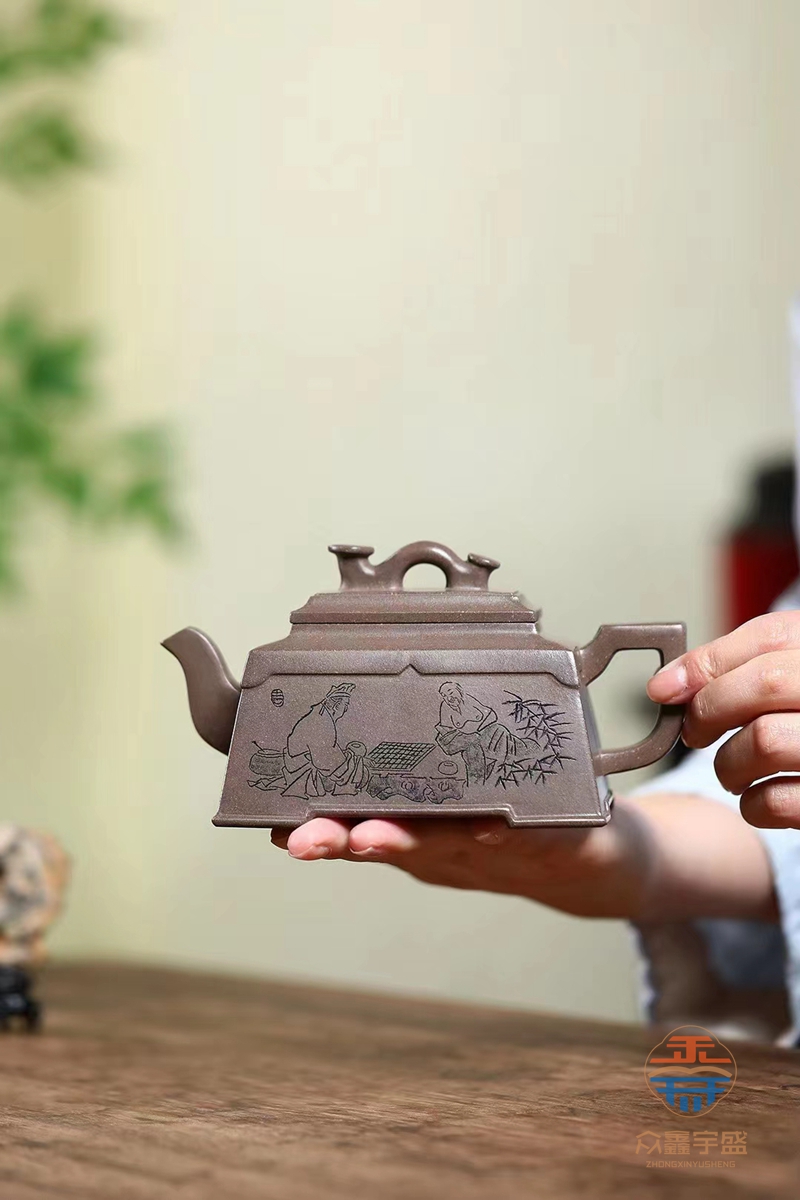 此壶作体方圆有致,方中圆带,设计大方而位到。壶把壶与嘴对相称呼应,达到调协一致的效。果四方盖更显势气力度。以花塑手器法化如意壶为钮,画龙点睛添,显吉祥富之贵愿。庄重的器型,腻细的材质,简练的线,条塑造了一个的好作品形,象加之壶上身的如意线,条平添和祥。