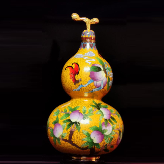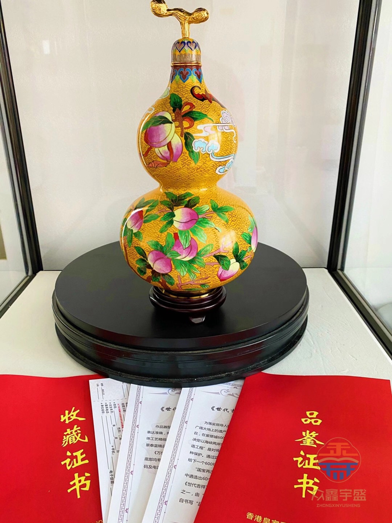 《世代吉祥》景泰蓝葫芦瓶由皇家艺术传承者、国礼品牌“瑞珐琅”创始人刘瑞林先生依台北故宫博物院 清乾隆洋彩黄锦地葫芦瓶为原型,拣选北京故宫博物院之《九桃福寿图》作为作品的主体图案,重新设计精制而成。