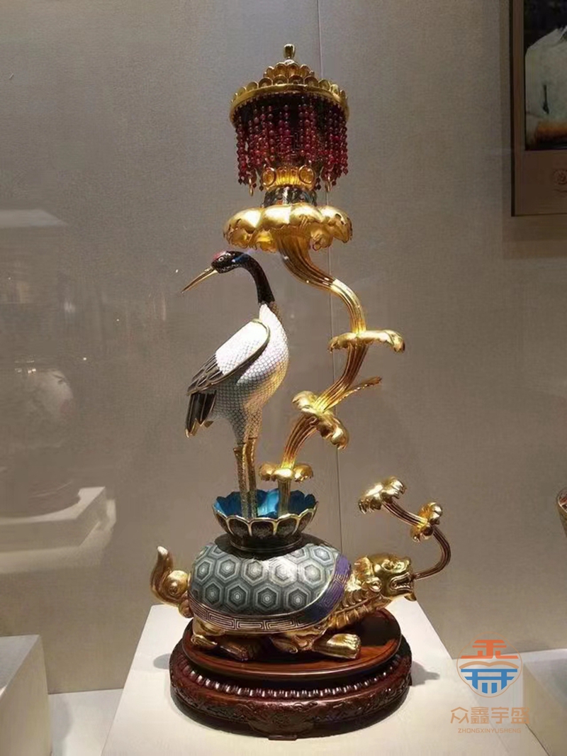 此款景泰蓝“龟龄鹤寿灯”作者为中国工艺美术大师戴嘉林的作品,使用中国传统题材,龟鹤为兽类鸟类长寿者,灯象征光明永照吉祥之意。作品造型生动、优美,比例得当,整体给人以古朴、金碧华美之感,寓意幸福长寿,光明永照。