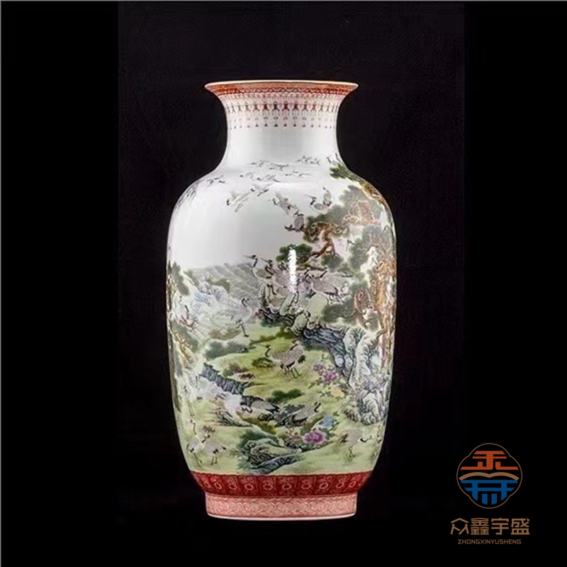 本品器型丰硕,超大规格,高达51cm, 重工粉彩描金,360度环绕,落地通景,满工满彩、 满工满色;密而不乱、繁而不杂 上有:手绘泰山鼎岳,连绵起伏 河山万里,中国气派 。下有:仙鹤呈祥 百姿百态; 灵趣妙动、栩栩如生。百鹤和鸣 和谐中国 百年伟业松绿万年 江山永固 基业长青