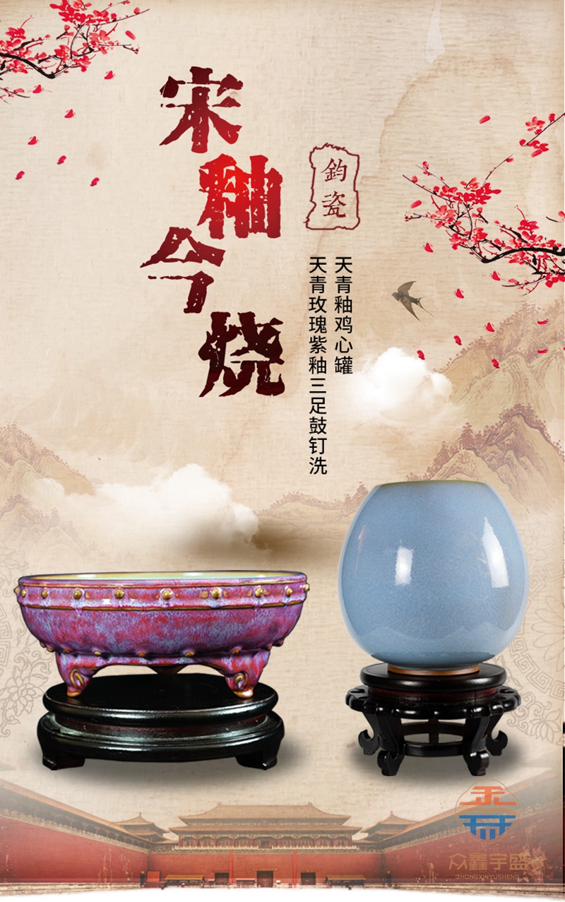 《宋釉今烧》钧瓷苗锡锦、苗长强将珍藏的珍贵宋釉 天青釉鸡心罐 天青玫瑰紫釉三足鼓钉洗,使宋代钧瓷神韵、风貌重现于世。 【藏品名称】:钧瓷宋釉今烧 【藏品规格】: 天青玫瑰紫釉三足鼓钉洗 高约10.5cm 直径约25.5cm 天青釉鸡心罐 高约20cm 口径约12cm