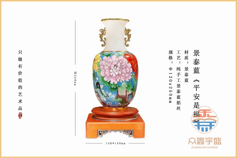 【藏品名称】:景泰蓝镶玉——小平安是福 “制尊大师”景泰蓝是由大师戴嘉林精心创作,600多位工艺美术师与工匠协作完成,由制胎、掐丝、烧焊、点蓝、烧蓝、磨光、镀金等108道传统皇家景泰蓝制作工艺外加60道现代纯手工工艺精琢而成,既传承了古代景泰蓝的制作工艺又具有现代时尚特征,有较高的鉴赏价值和收藏价值,堪称中国传统工艺的集大成者,实现传承和弘扬国粹文化艺术的非凡价值。