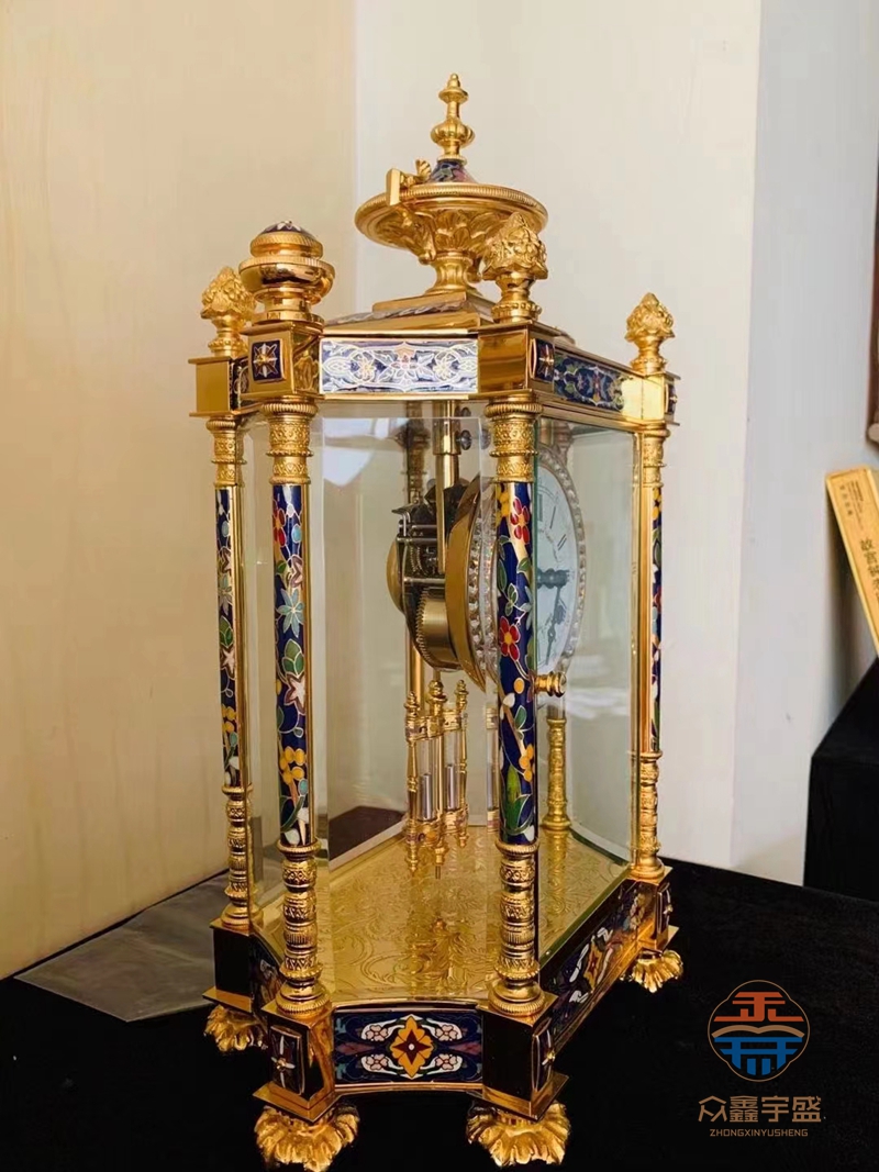 【藏品名称】:钟声平安·珐琅六柱钟 刘永森 座钟为精美六柱设计 【藏品尺寸】:260x175x440 mm 【藏品重量】:净重约8.5 kg 德国“赫姆勒”机械机芯