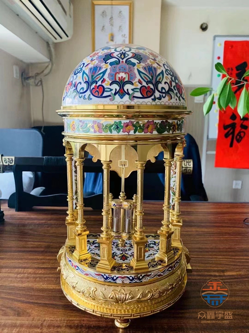 【藏品名称】:钟声平安 ·珐琅圆顶钟 【藏品尺寸】:240x150x400 mm 【藏品重量】:净重约6 kg