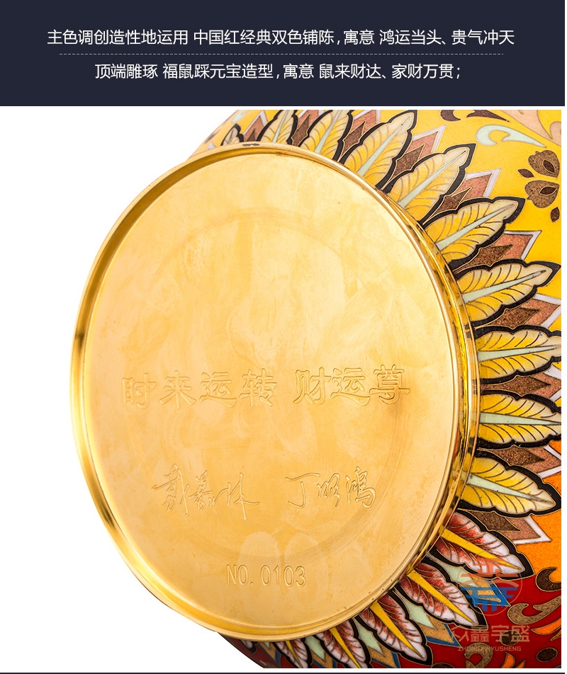 【藏品名称】:时来运转财运尊景泰蓝 【藏品规格】:高约45cm 底径约15cm 口径约4.3cm 【创作大师】:戴嘉林 丁明鸿 【限量发行】:2020套 第一款可上下独立转动的景泰蓝生肖葫芦转瓶 第一款实现一瓶、二转、四效果的生肖景泰蓝作品 将宫廷文化与生肖文化完美融合,献礼紫禁城600周年