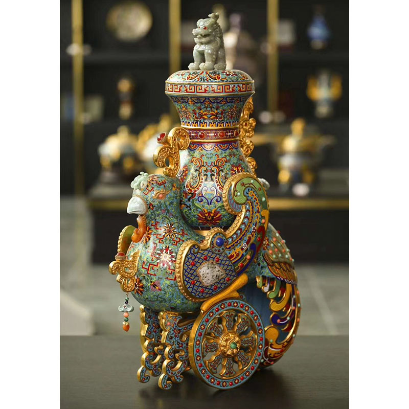 该作品造型为天鸡凤擎,背负螭耳宝瓶,足登镂空八宝吉祥双轮,长尾垂卷。整体寓意为:天鸡凤辇降吉祥,万事如意保平安。刘永森大师依清宫廷责品原形体,加以继承发展,不但从花纹色彩上进行了新的创作,而且在诸多处用高档翡翠,玛瑞,青石,松石,红珊瑚等多种宝石镖嵌。