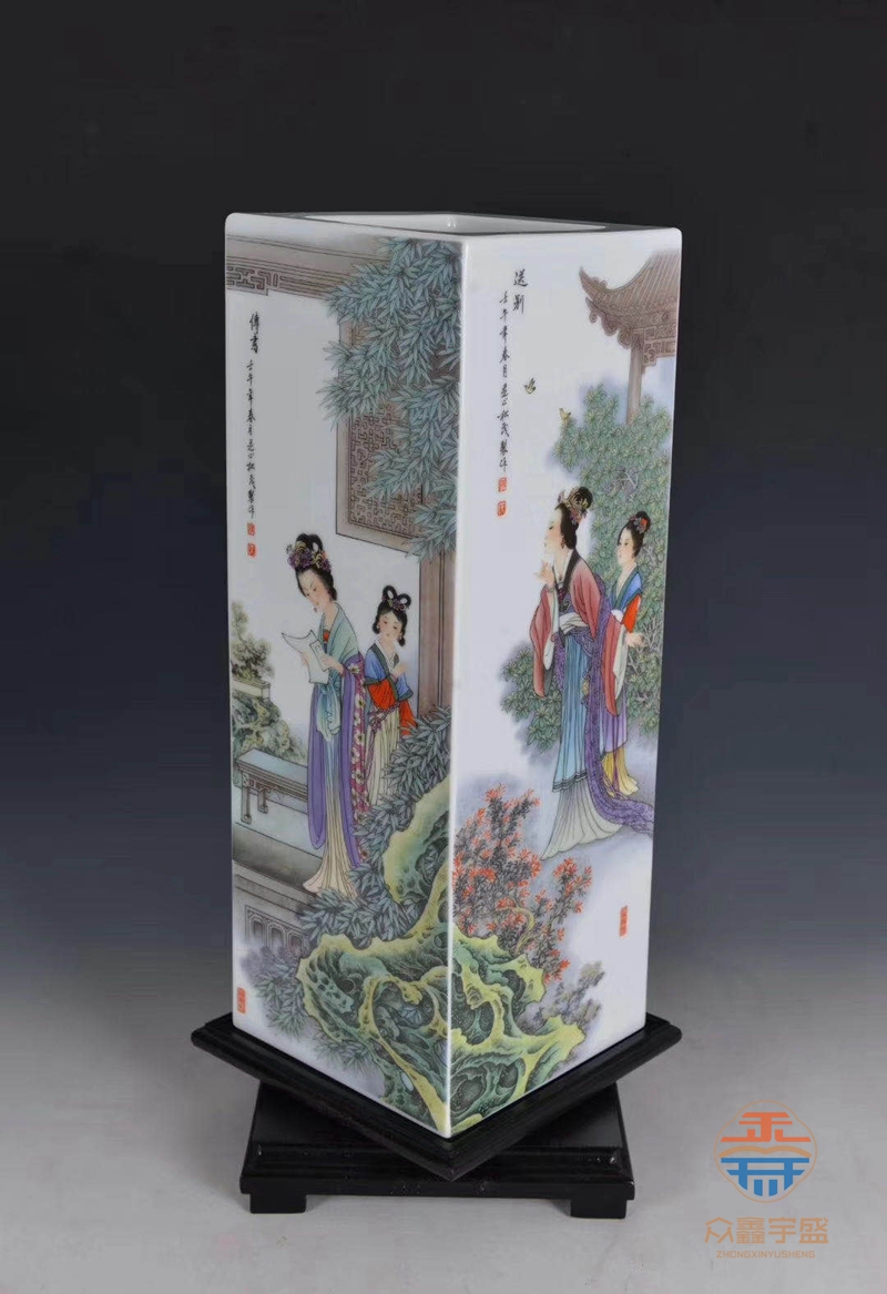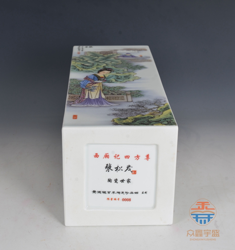 【藏品名称】:张松茂《西厢记》粉彩四方尊 【藏品规格】:瓶高约47.5cm、直径约16cm口径约12cm